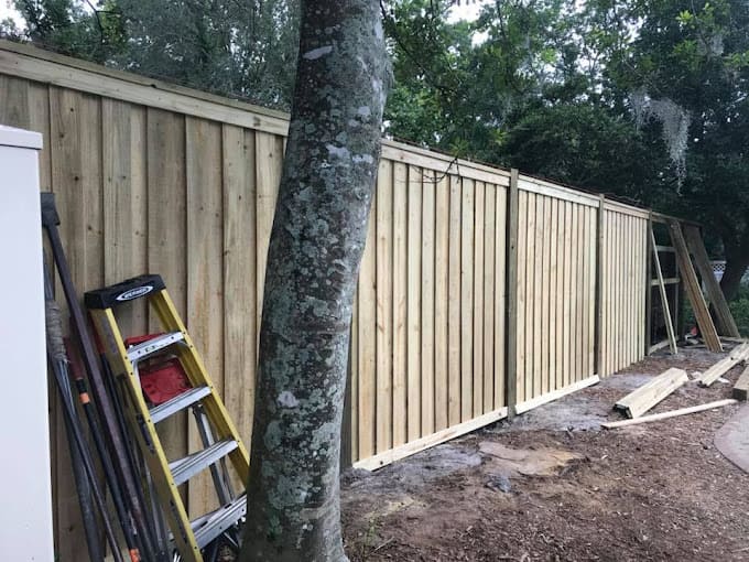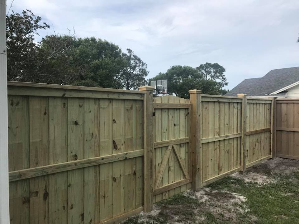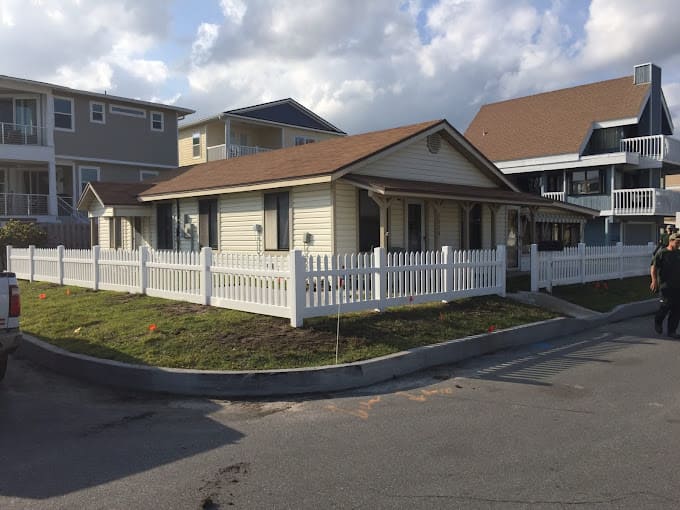 Gray WearDeck decking and skirting with Owens Corning structural lumber and custom handrails. Fernandina Beach, FL